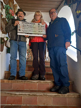 Auf Initiative vom Vorstand des Krieger und Veteranenvereins Partenkirchen Heinrich Waldhör wurden alle Kriegergedenktafeln an den Aufgängen zur Klosterkirche St. Anton registriert und archiviert. Besonders in Mitleidenschaft gezogen war die Marmortafel der Partenkirchner Kriegsteilnehmer vom deutsch-französchischen Krieg 1870/71. Georg Rieger restaurierte die Tafel kunstvoll und der Partenkirchner Veteranenverein übernahm die Kosten. Der Andreas Hofer Bund e.V. Deutschland, der selbst deutsche Kriegsgräber auf verschiedenen Kriegerfriedhöfen im Elsass und im Saarland betreut, erfuhr von den Arbeiten und beschloß bei seiner letzten Bundesleitungssitzung den Veteranenverein einen Betrag von 300 Euro zukommen zu lassen. Hier bei der Scheckübergabe am Treppenaufgang in St. Anton links Heini Waldhör Vorstand des Veteranenvereins, Monika Bruchertseifer, Finanzreferentin Andreas Hofer Bund e.V. und Hermann Unterkircher, Bundesvorsitzender Andreas Hofer Bund e.V.